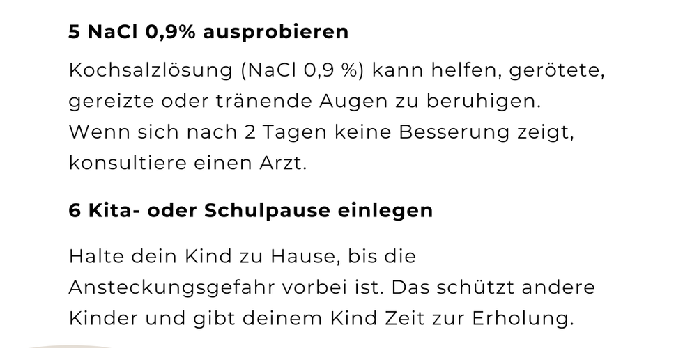 Ein Arztbesuch ist nicht immer notwendig, aber halte die Augen deines Kindes sauber, indem du sie vorsichtig mit sauberem Wasser (oder gekochtem, abgekühltem Wasser) reinigst. Kalte Kompressen können helfen, Entzündungen und Trockenheit zu lindern.